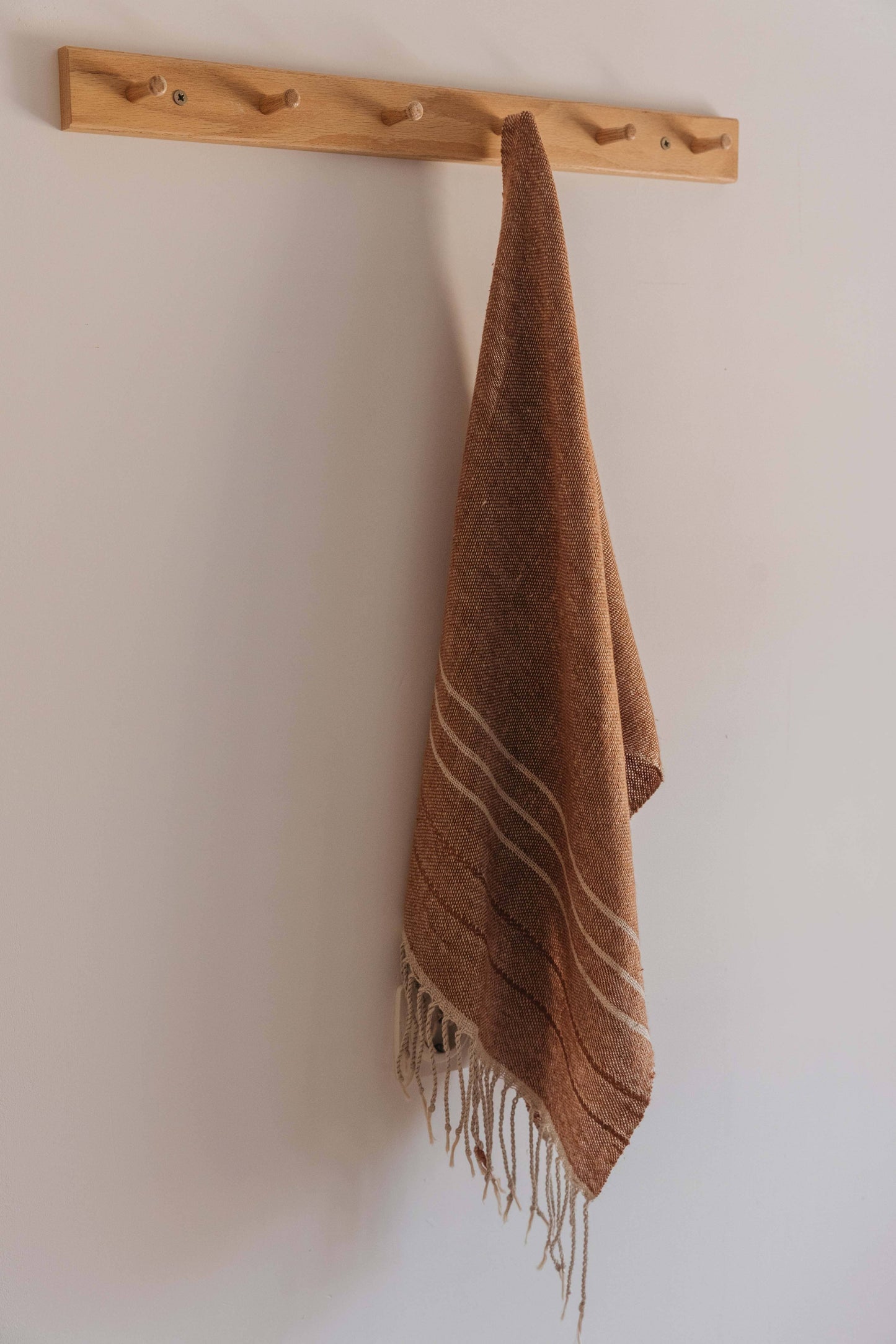 Pieza única con urdimbre de lino gris con trama de lino caldero. Con rayas en color gris y decoraciones en color caldero. Con flecos largos.