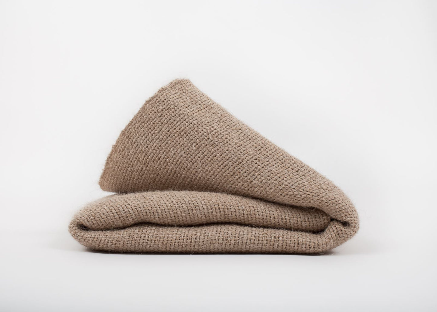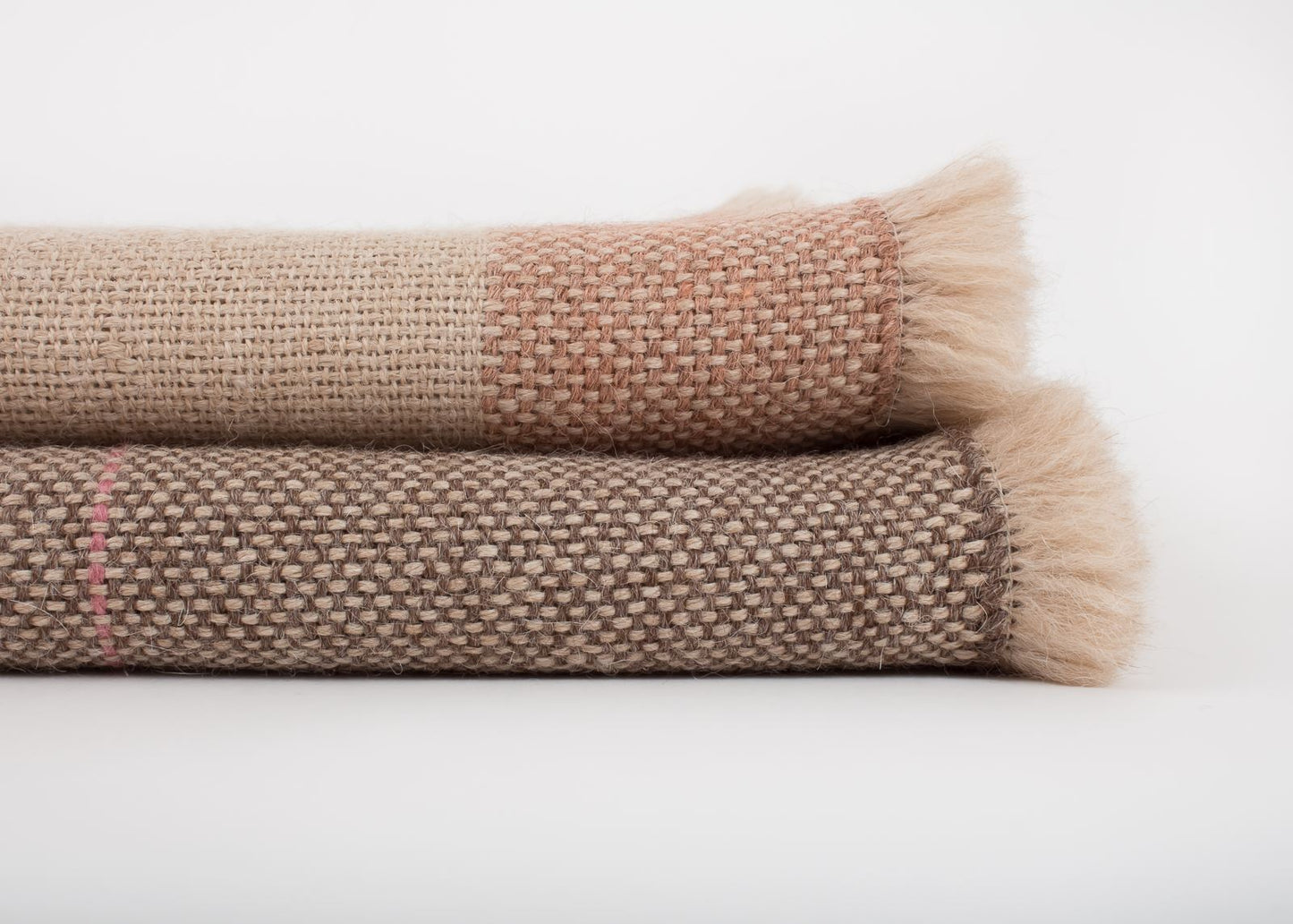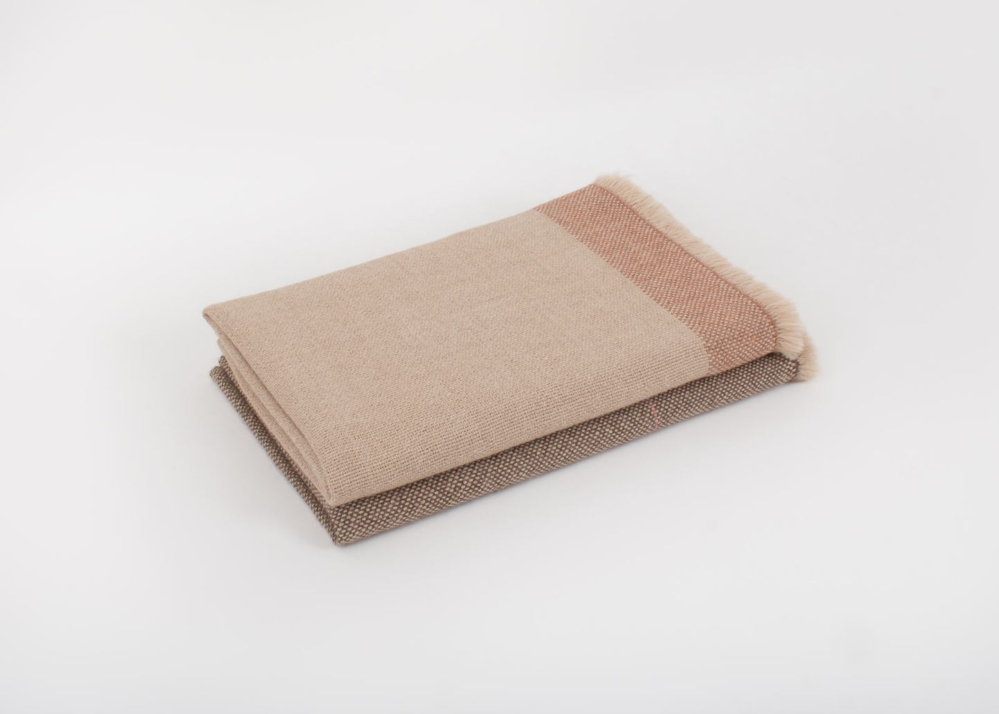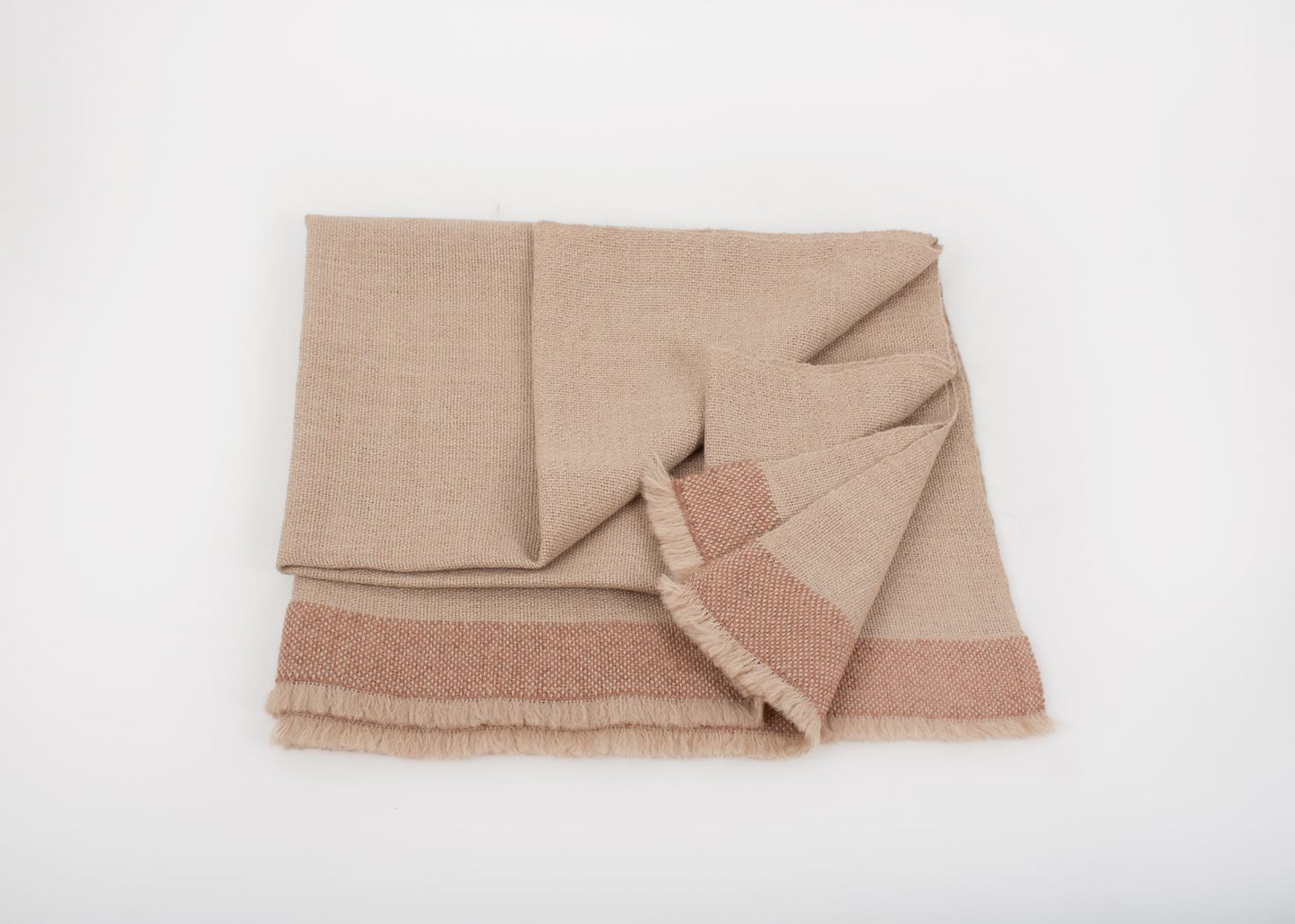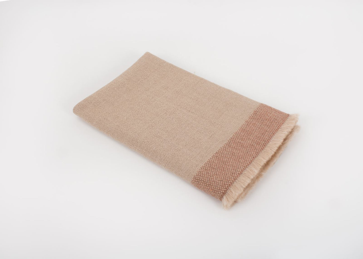 Pieza única con urdimbre y trama de alpaca nuez tostada. Decorada con una franja en color rosa malva y otra franja en color gris niebla.