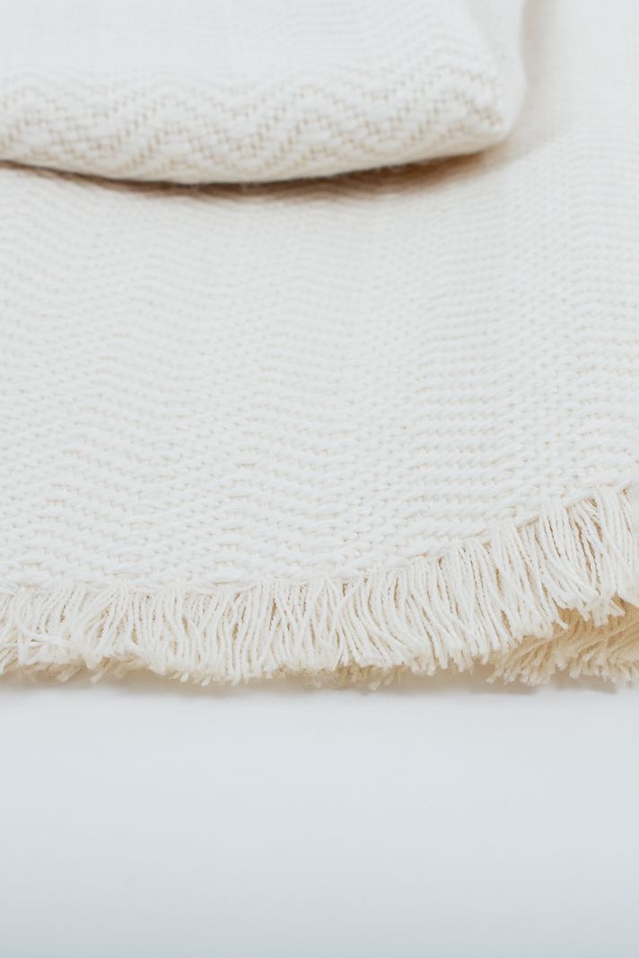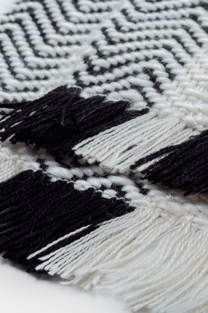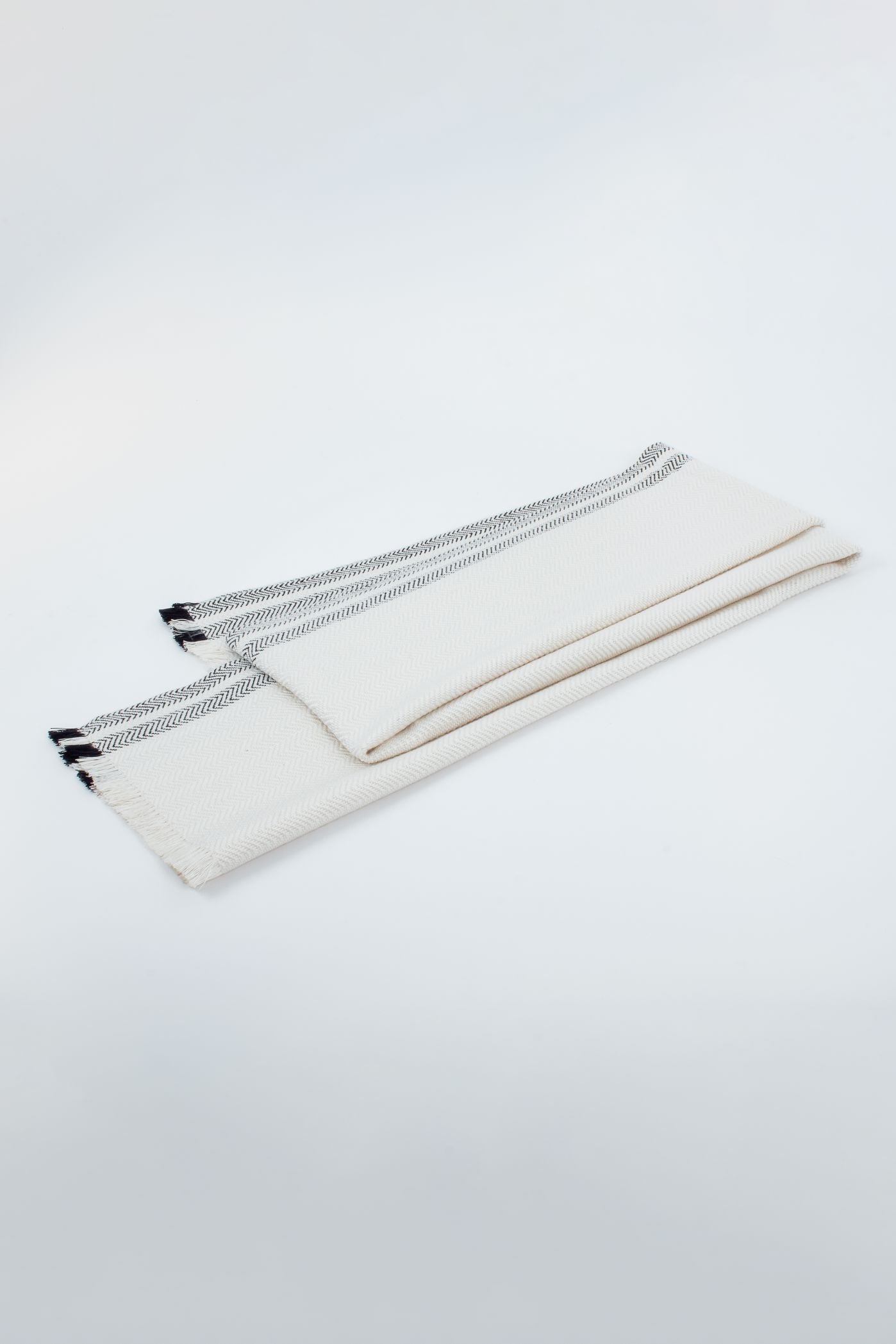Pieza única con urdimbre de seda blanca y trama de lana merino blanca. Decorada con franjas negras en los laterales.