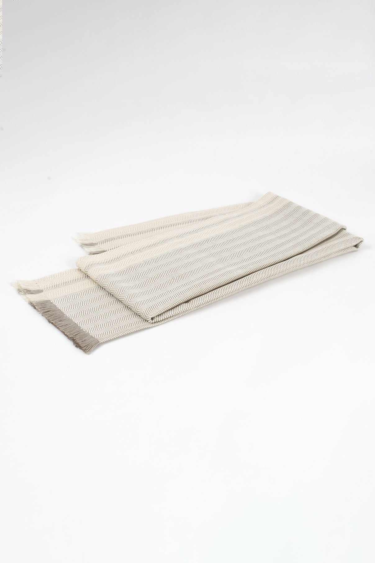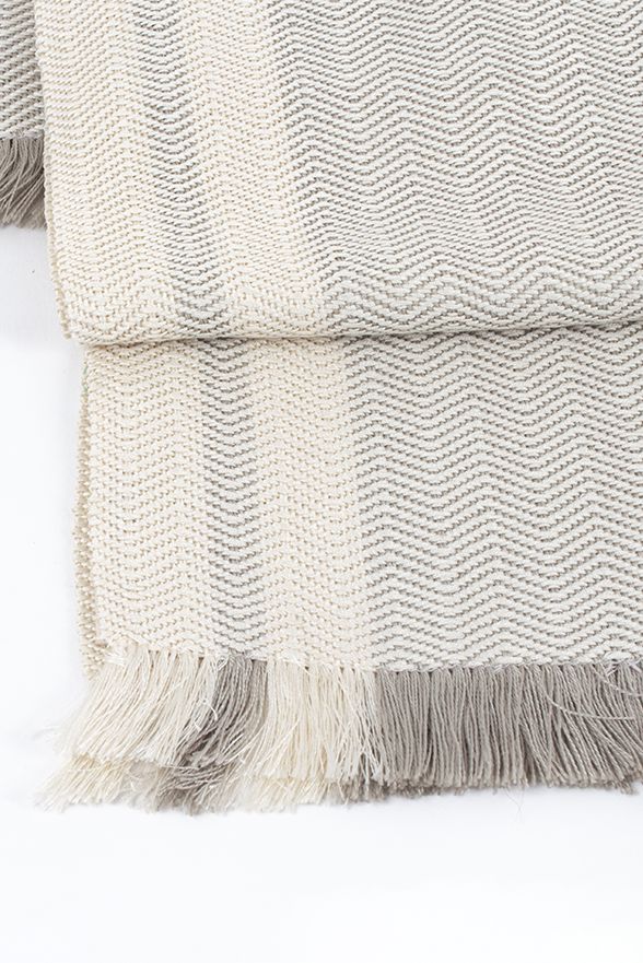 Pieza elaborada de manera artesanal, con fibras naturales de primera calidad. Con urdimbre en seda color gris perlado y trama en seda blanca. Con franjas blancas en los laterales.