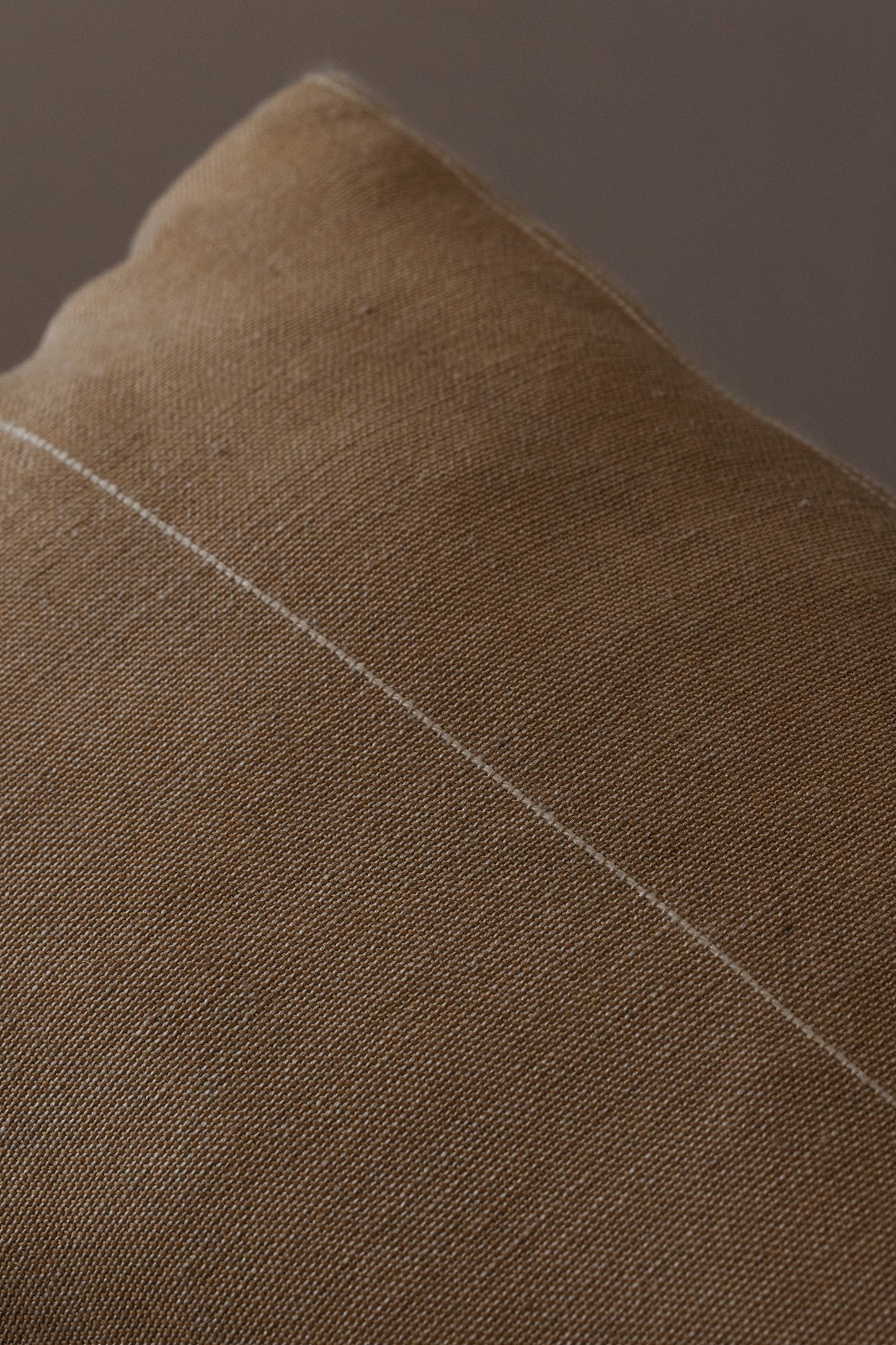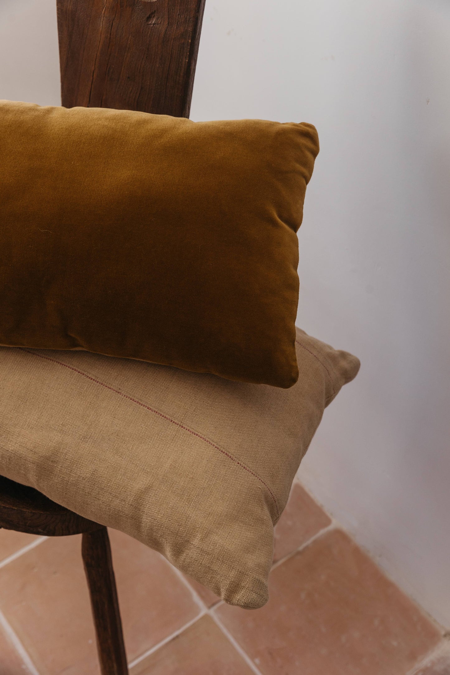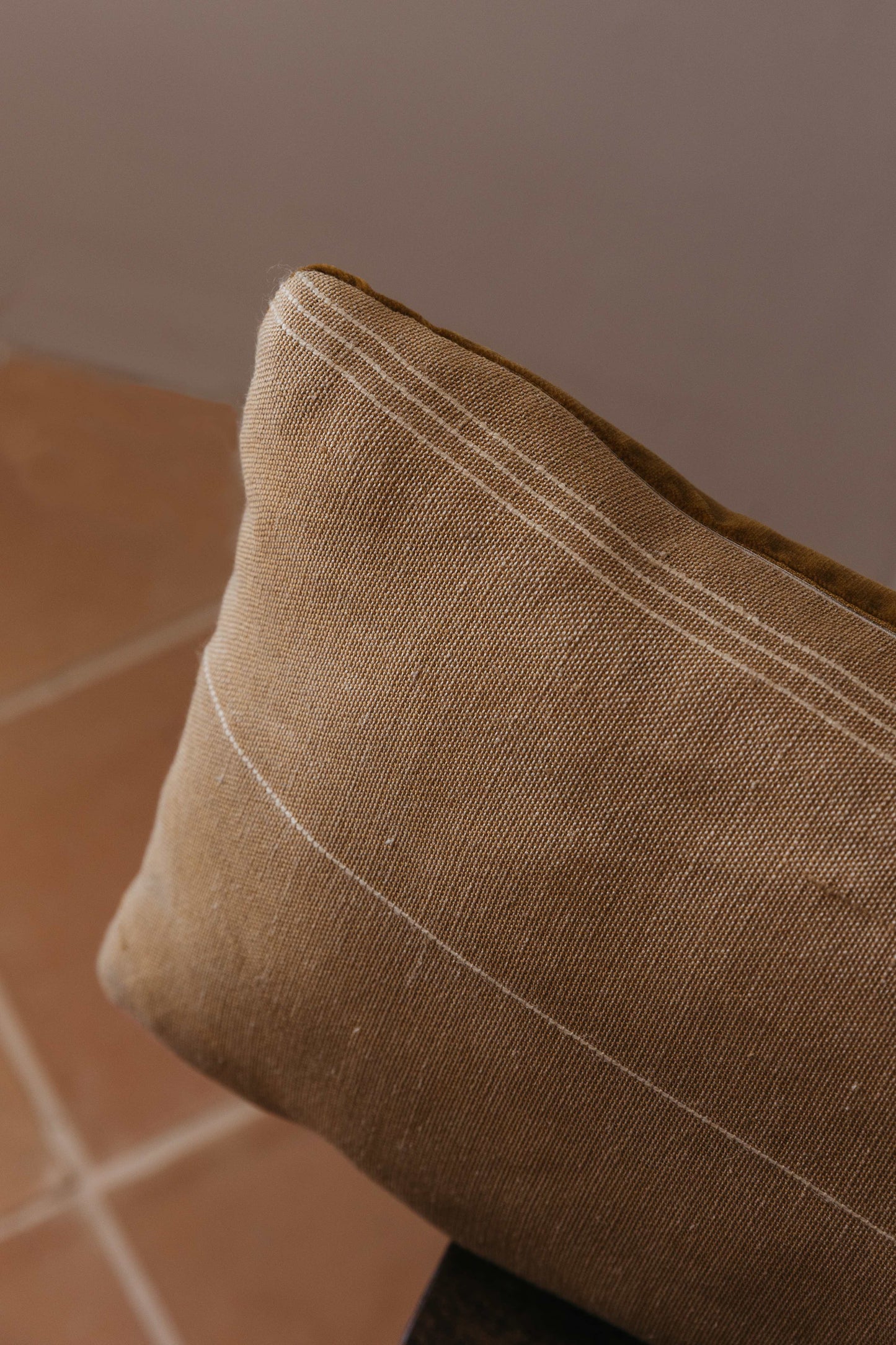 Pieza única con urdimbre de lino gris y trama de seda natural amarilla, teñida con tintes naturales. Decorada con rayas finas horizontales de color amarillo claro. Con trasera de terciopelo mostaza.