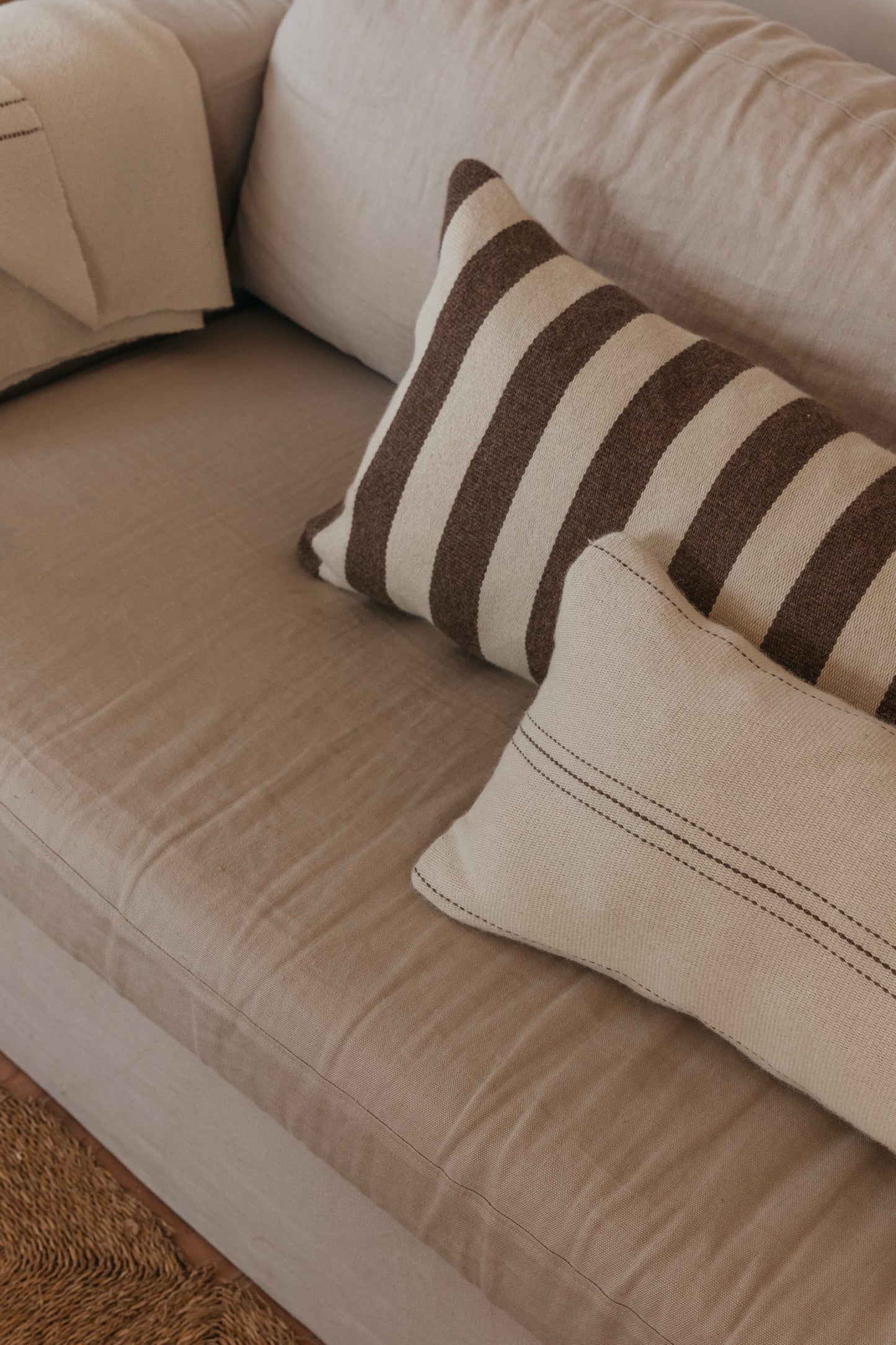 Pieza única con urdimbre y trama de alpaca cruda. Decorada con franjas en color tabaco.