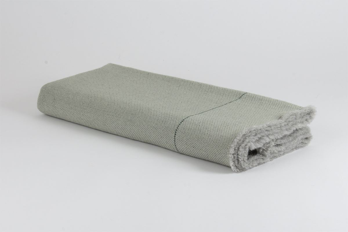 Pieza exclusiva elaborada de manera artesanal con fibras naturales de primera calidad. Con urdimbre en alpaca color gris niebla y trama en lana merino color verde claro. Decorada con una raya verde bosque.