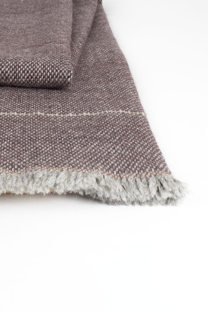 Pieza única con urdimbre de alpaca color gris niebla y trama de alpaca color malva oscuro, con tintes naturales. Detalle de rayas en color nuez.