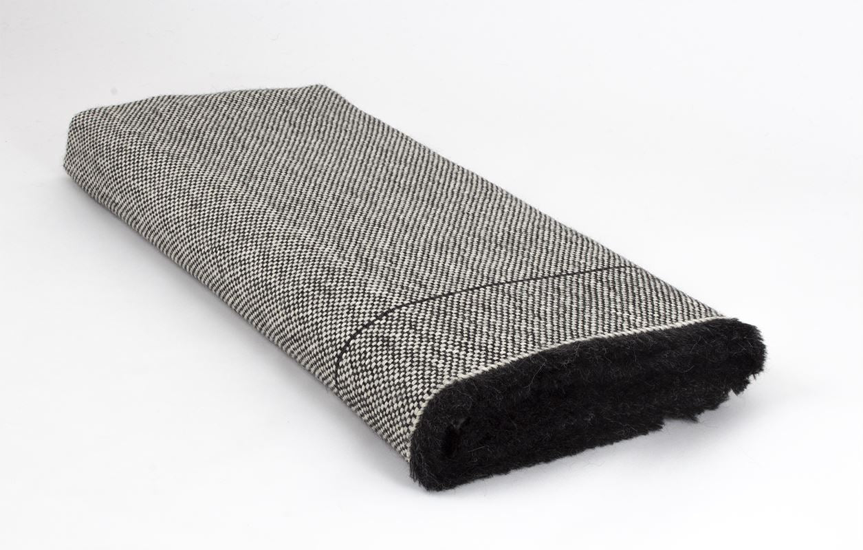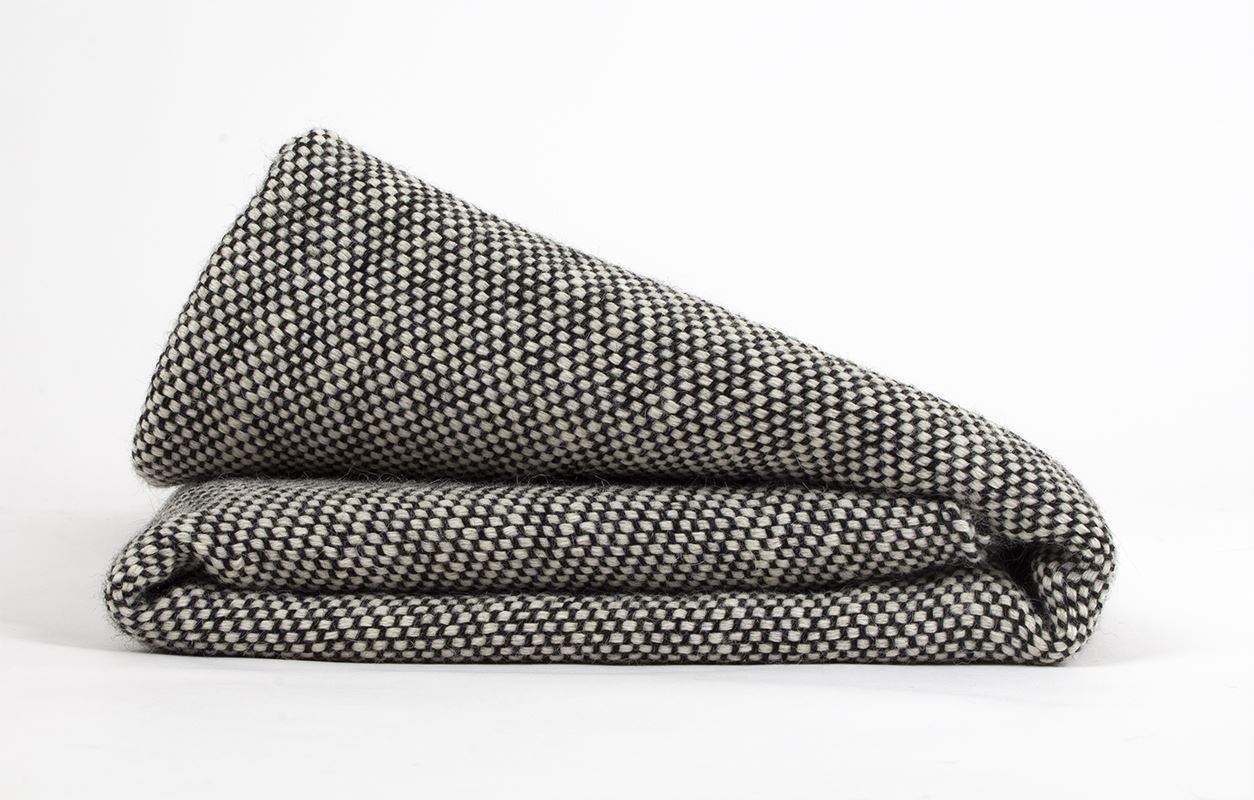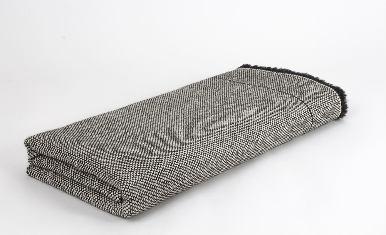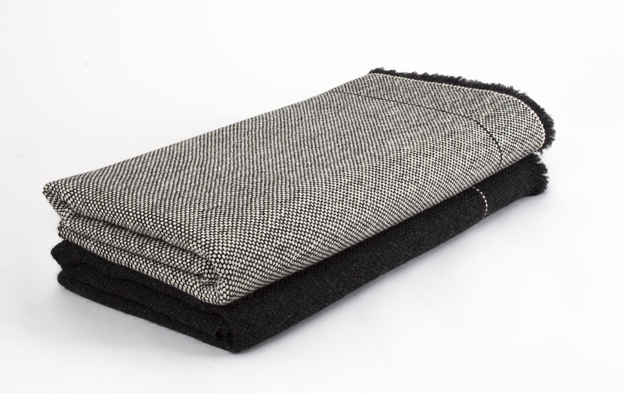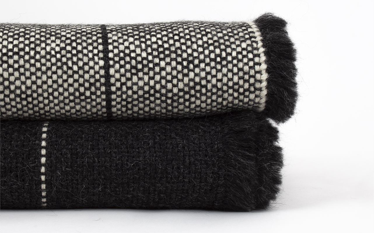 Pieza exclusiva elaborada de manera artesanal, con fibras naturales de primera calidad. Con urdimbre en alpaca antracita y trama en alpaca cruda. Decorada con una raya fina negra.