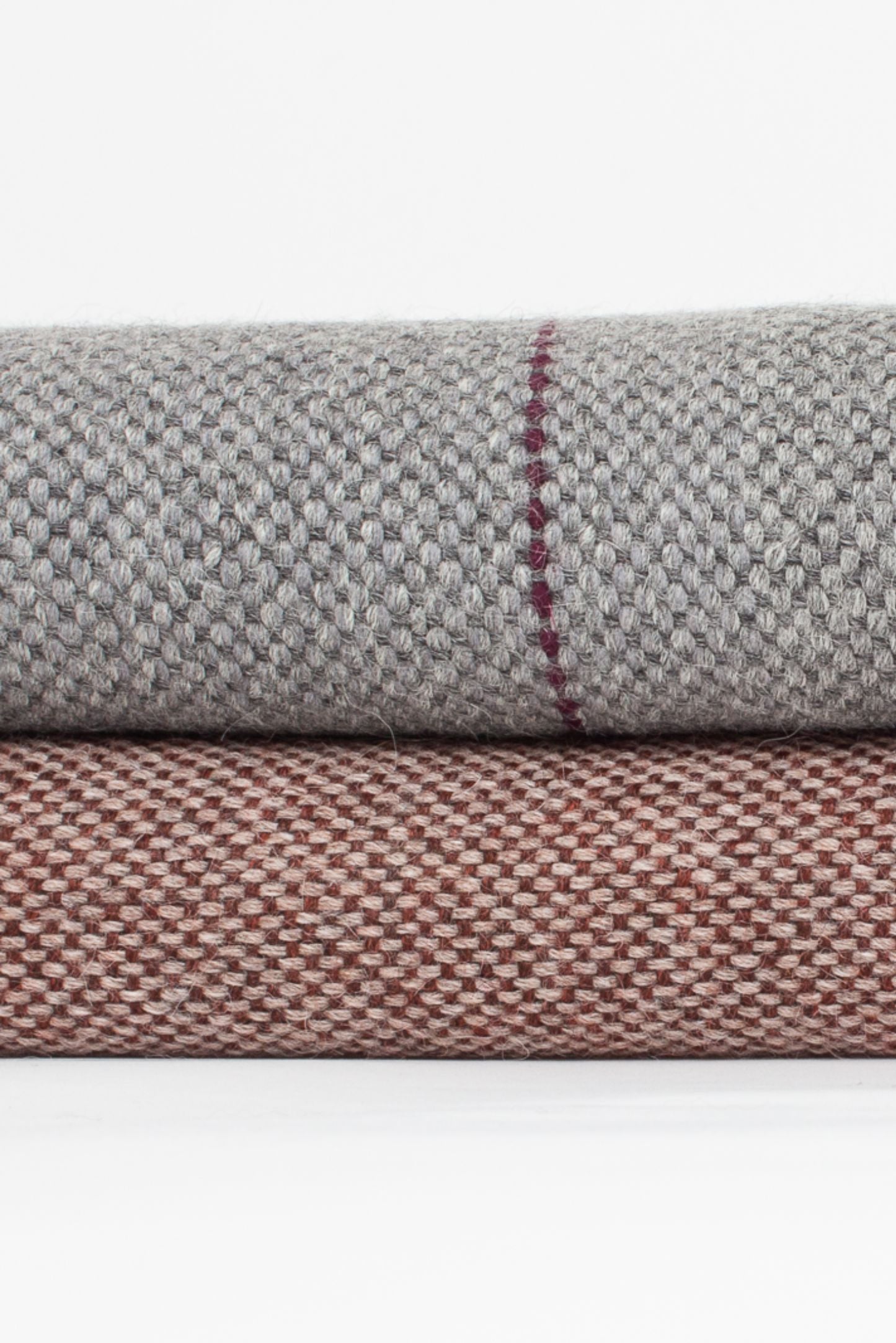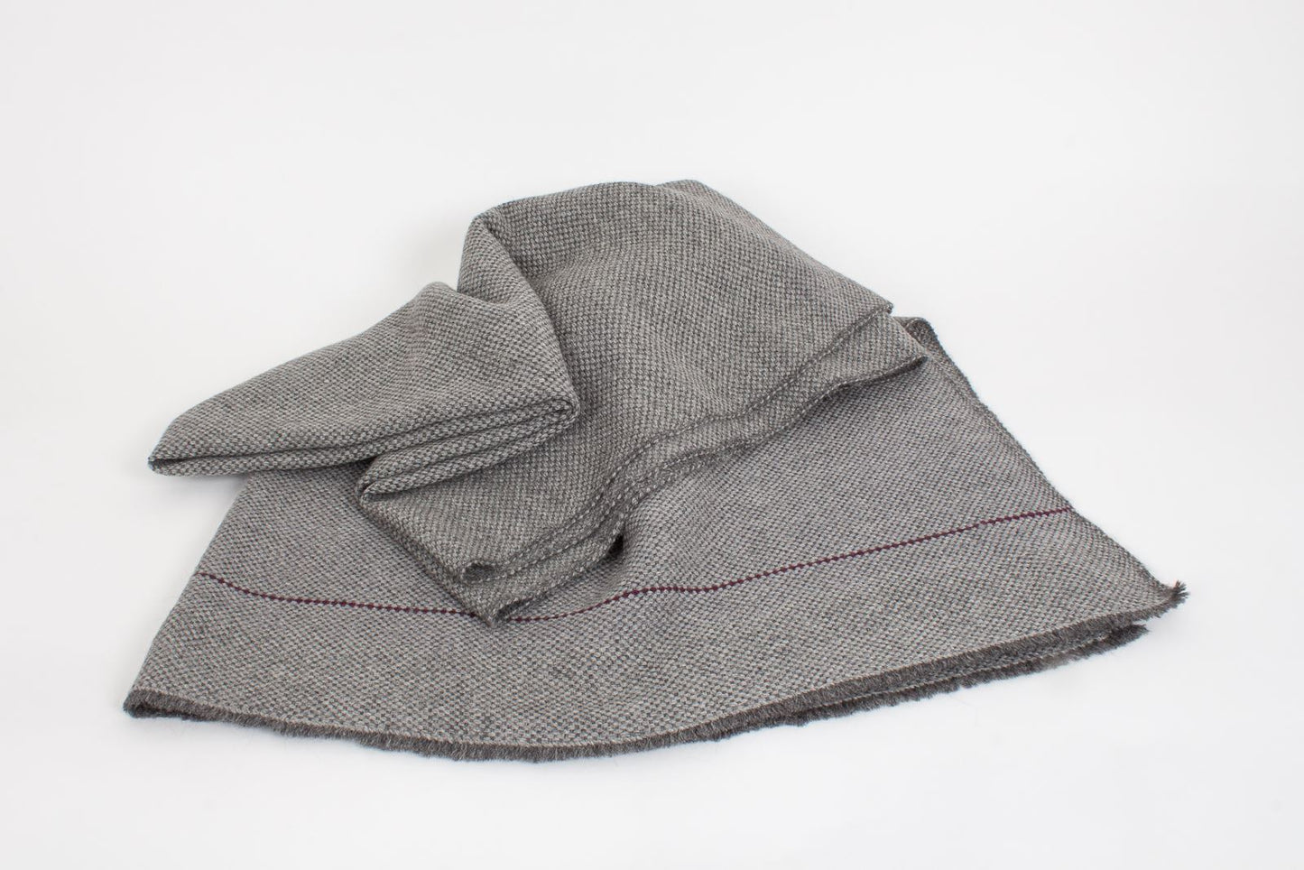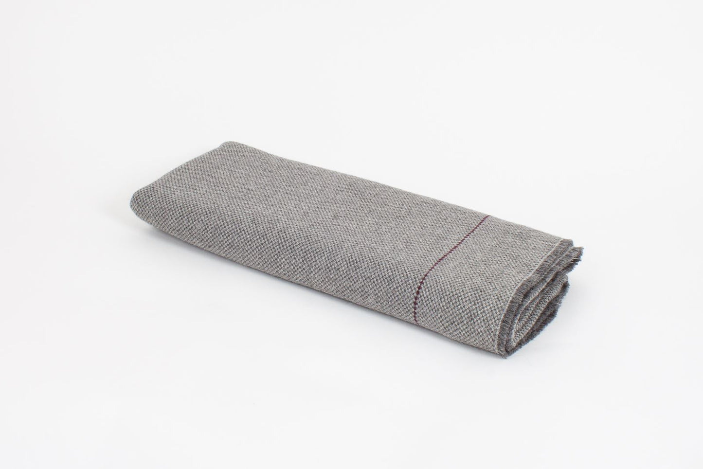 Pieza única con urdimbre de alpaca gris marengo y trama de alpaca gris lluvia. Decorada con una raya berenjena.