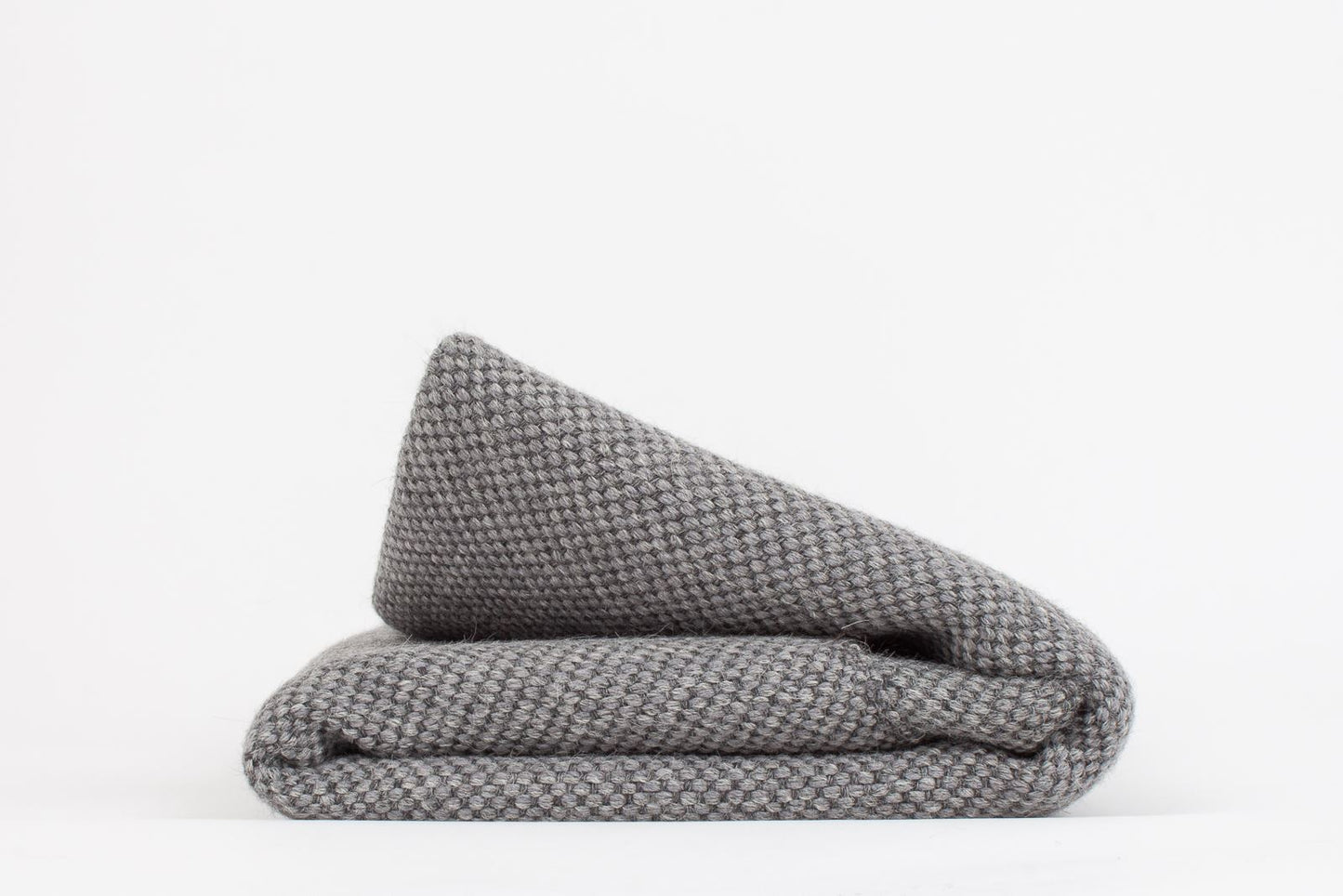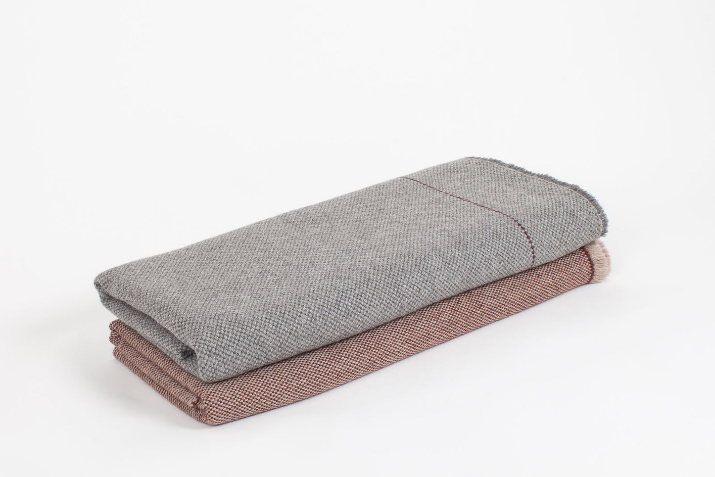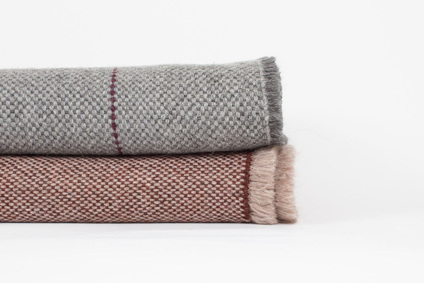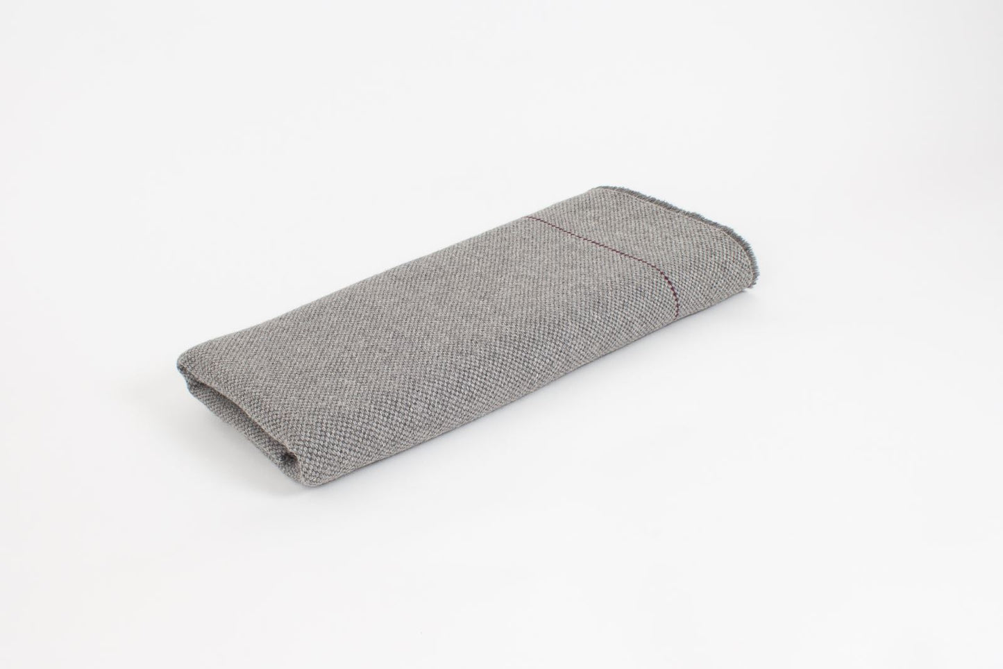 Pieza única con urdimbre de alpaca gris marengo y trama de alpaca gris lluvia. Decorada con una raya berenjena.