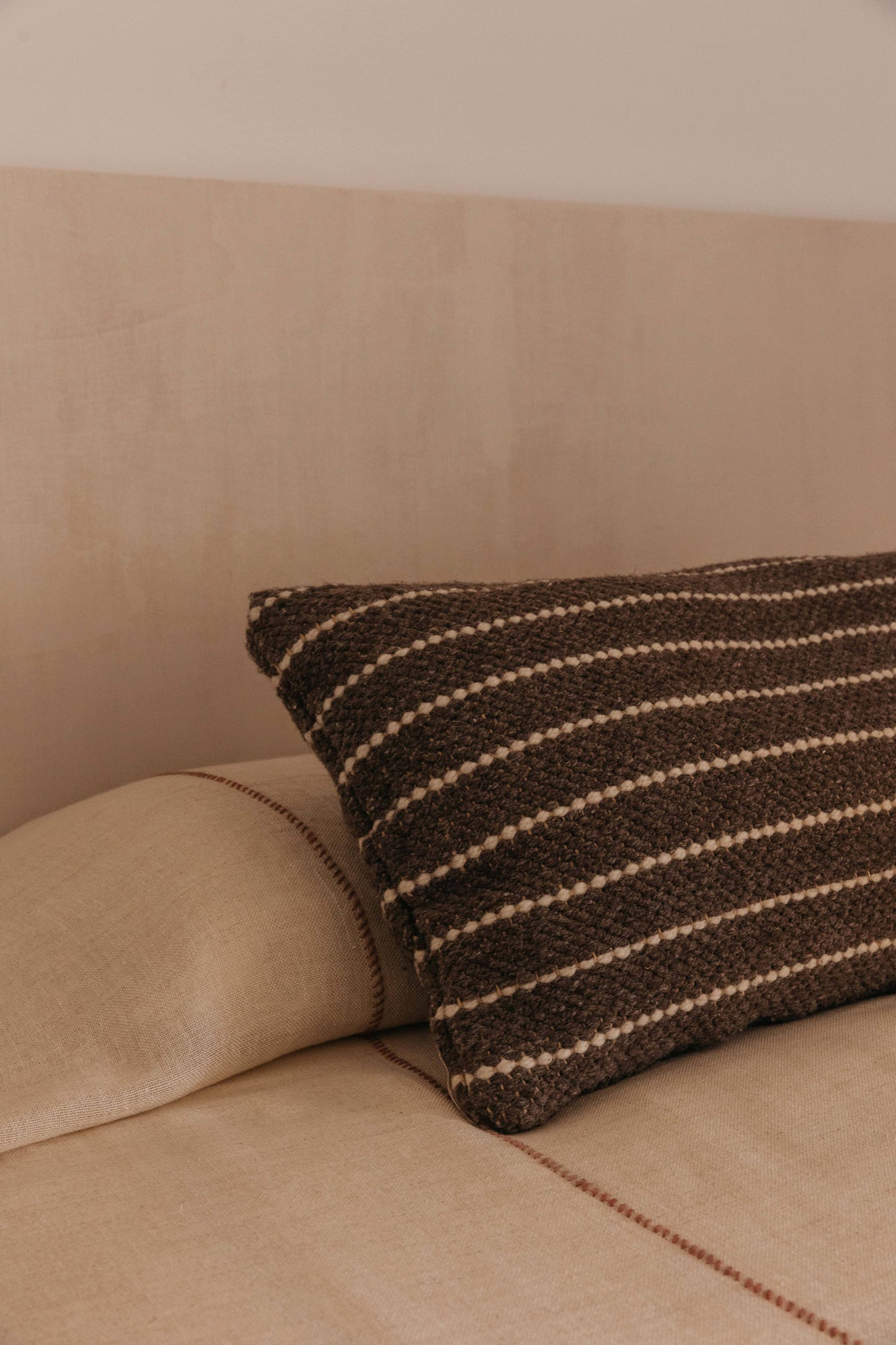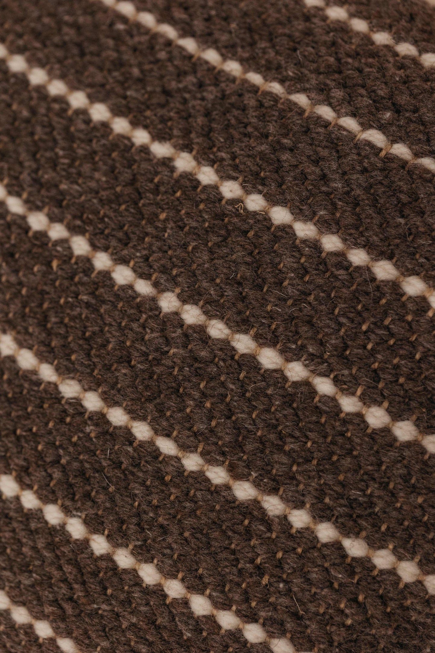 Pieza única en urdimbre de yute natural y trama de lana color topo. Decoración de franjas de lana blancas.