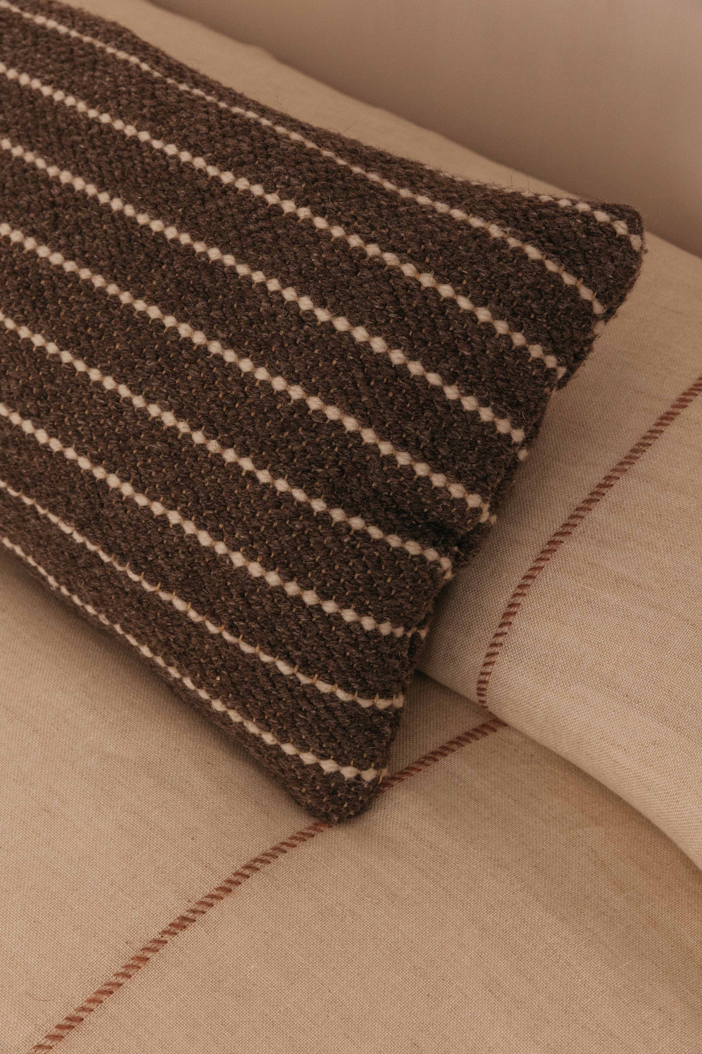 Pieza única con urdimbre de lino gris lejiado y trama de lino blanco. Decorada con dos franjas en modelo zigzag de alpaca color rosáceo.
