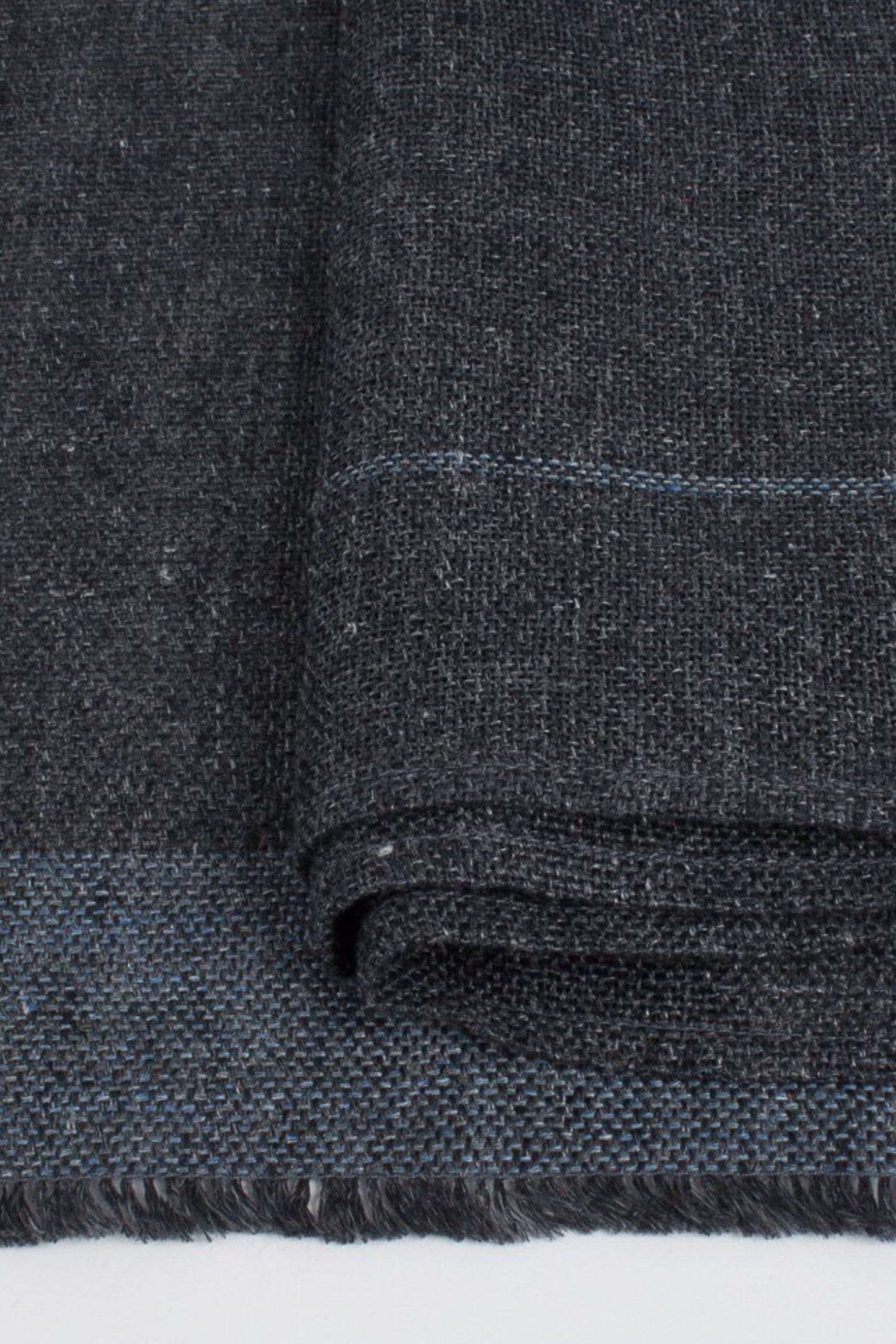 Pieza única con urdimbre y trama de lino color gris marengo. Decorada con una franja en color azul melange.
