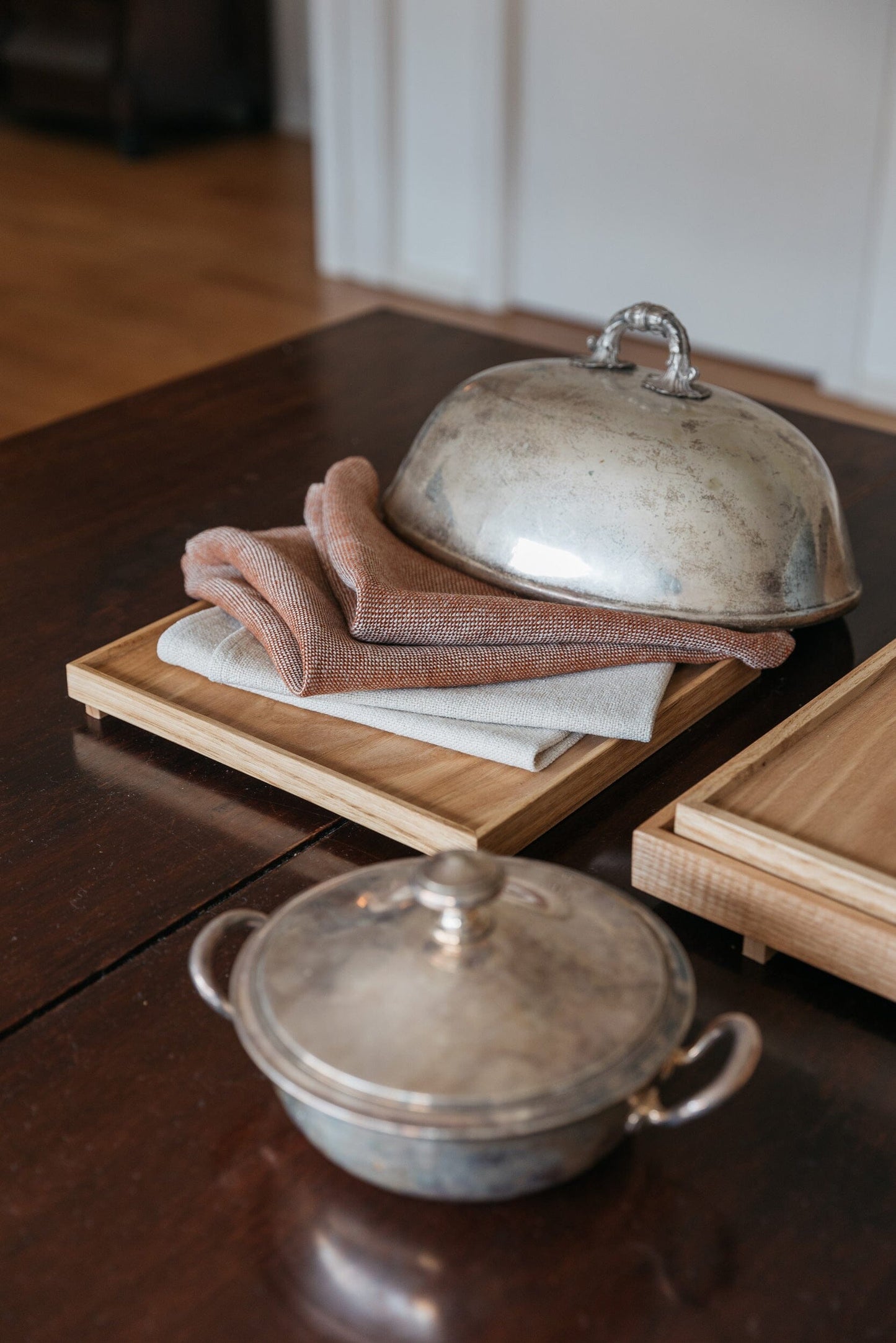 Pieza única con urdimbre de lino gris y trama de lino color caldero. Con dobladillo.