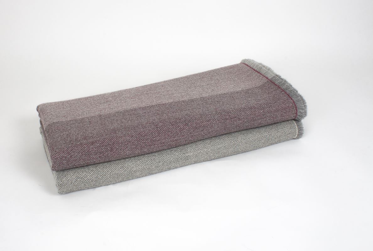 Pieza exclusiva elaborada de manera artesanal con fibras naturales de primera calidad. Con urdimbre de alpaca en dos tramos, con dos tonos de gris y tejida con trama de alpaca baby con seda color cereza.