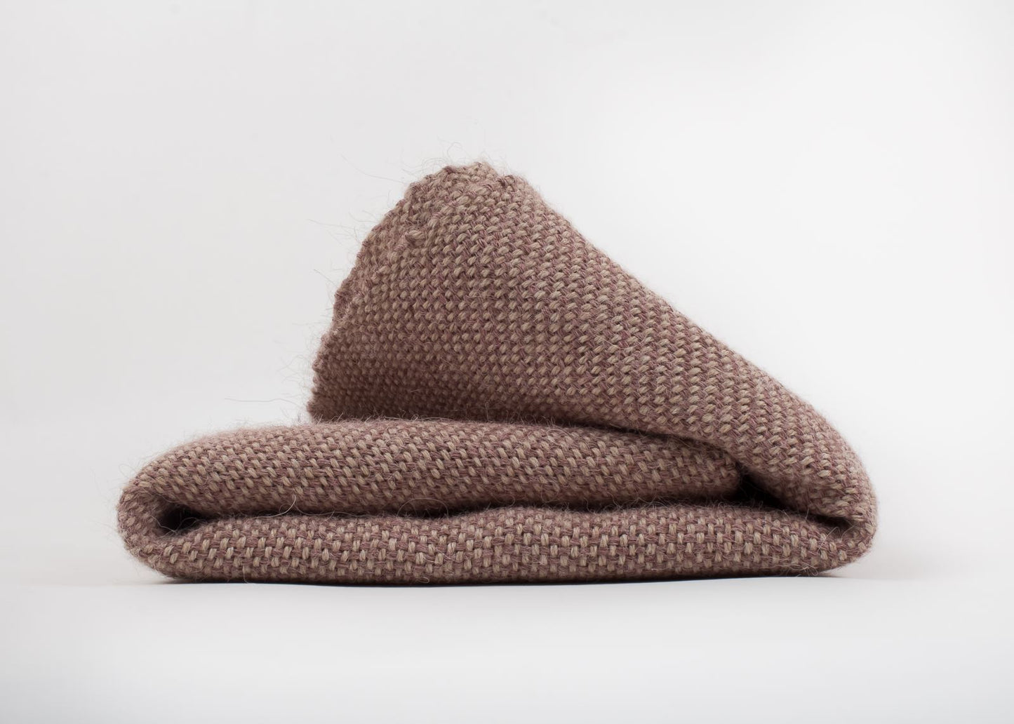 Pieza única con urdimbre de alpaca nuez tostada y trama de alpaca color rosa pastel, con tintes naturales. Decorada con una raya fina en color rosa lila.